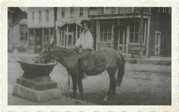 Ruth Whitcomb allowed her horse to have a drink at the watering trough, which was located in front of the Neillsville City Hall, along West Fifth Street in the late 1800s. In the background, at the far left, the Congregational Church is partially visible, along with other shops and the old Neillsville Hotel Saloon. The name Sol Jaseph is posted at the right end of the hotel’s balcony porch railing. (Photo courtesy of Bill Roberts’ family collection)