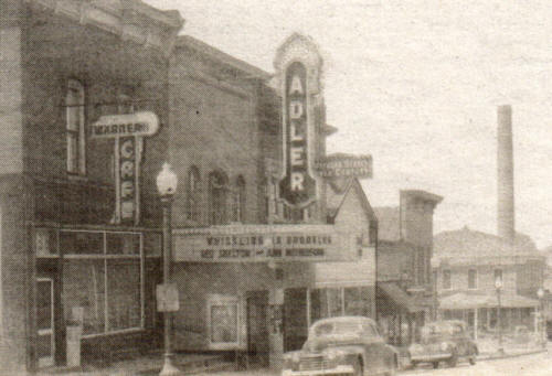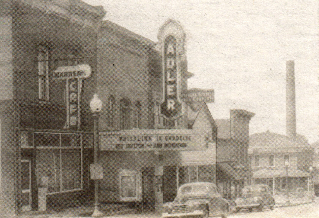 The west side of the 600 block of Hewett Street, Neillsville, circa 1940. The businesses, left to right: Wagner’s Café, the Adler Theatre when the movie “Whistling in Brooklyn” with Red Skelton and Ann Rutherford starring was showing, and Northern States Power Company. (Photo courtesy of Bill Roberts family collection)