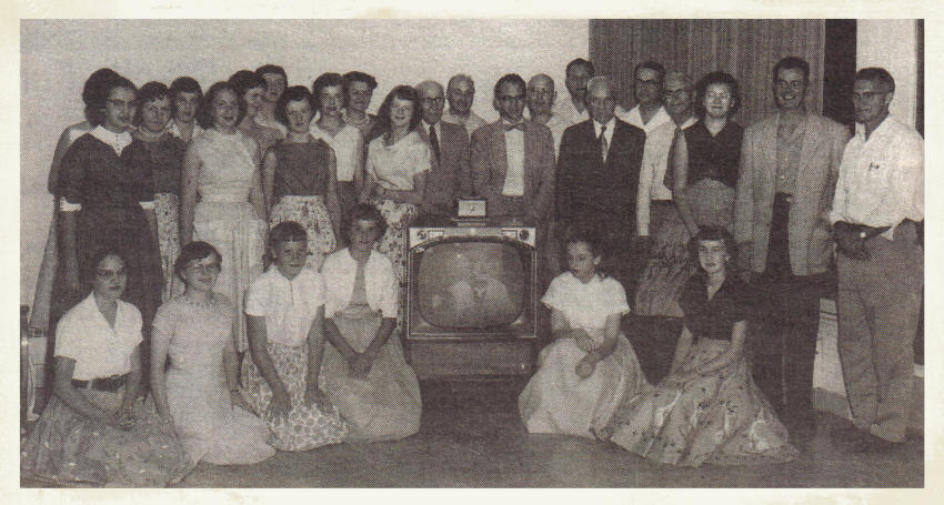 The Kiwanis Club members and Neillsville Senior Girl Scouts worked together in the Kiwanis Club’s grilled chicken stand at the 1956 Clark County Fair. Proceeds from the sales were used to purchase a TV set, which was presented to the Memorial Hospital for the patients to view. (Kneeling left to right) Erma Stucki, Sharon Morley, unidentified, Frei, Sandra Buddenhagen and Jeannie Mabie, (standing, left to right) Judy Reese (who is hidden), Corrine Braatz, Donna Burr, Nancy Jenni, Mona Hoesly, Mary Ylvisaker, Kathleen Krause, Dolores Burr, Carol Rosenberg, Doris Warren (hospital administrator), Betty Ylvisaker, Judge Oscar W. Schoengarth, Elmer Georgas, Henry Rahn, Milo Mabie, Ralph Bauer, Al Devos, Dr. Kenneth Manz, William A. Campman, Cara Jean Jones, Morris Blodgett, and Hubert Quicker. (Contributed photo)