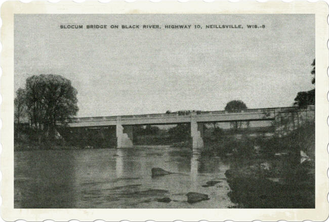 The Slocomb (shows Slocum on the photo) Bridge, which spanned the Black River on Neillsvilles west side, was constructed during the 1930s. Also at that time, Highway 10 was improved with new grading and a concrete surface from Neillsville to Fairchild.