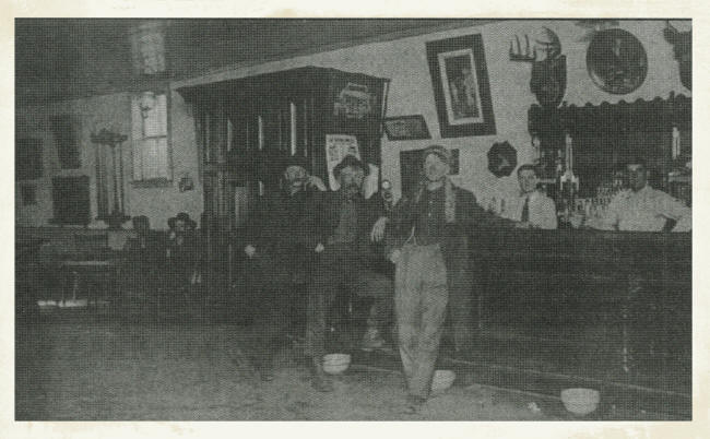Al Cowles Saloon was a Neillsville business in the early 1900s. Standing in back of the bar, left to right: Al Cowles and Frank Lange. Seward Way is the middle man standing at the front of the bar. The other two men at the bar are unidentified (as are two men at a table to the left rear). (Photo courtesy of Bill Roberts)