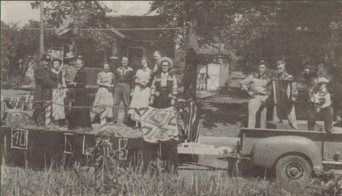 Clark County was one amongst other communities, which celebrated the Wisconsin State Centennial in 1948. The Neillsville community held an event that included a parade. The 40 Square Dance Club made up a float whith some of the club members demonstrating dancing sets. The two men standing in this pickup box, (left to right) are Art Nemitz, the dance caller and Louie Nemitz, who was a well-known and popular accordion player in the Neillsville area. The others in the photo wre not able to be indentified. (Photo courtesy of Margaret Nemitz) |