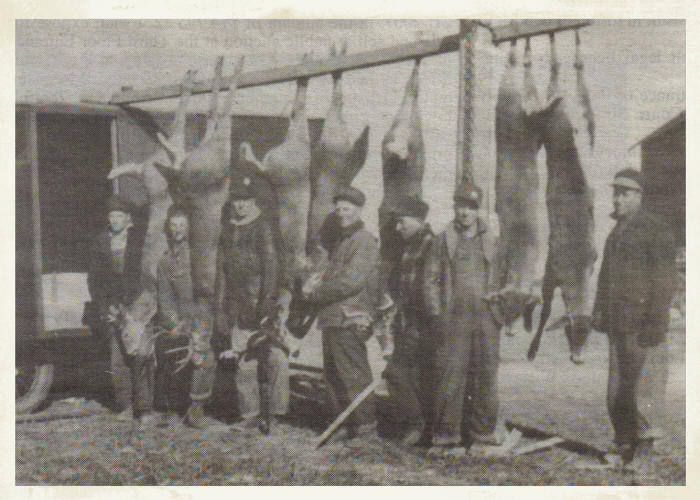 The Pleasant Ridge Hunting Buddies, circa 1930, had a good hunt the year that each hunter bagged a buck, as shown above. (Left to right) Bill Vine, Charlie Hubing, Ernest Vine, Art Hubing, Henry Hubing, George Hubing and Alfred Magnuson. (Photo courtesy of Charlotte (Hubing) Jacob)