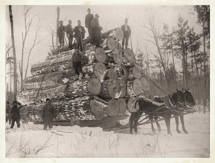 The load of pine logs, shown above represents the logging industry of the late 1800s, in Clark County. The pine trees were harvested in the Cunningham Creek area, and then hauled by bobsleds to a landing along Black River.