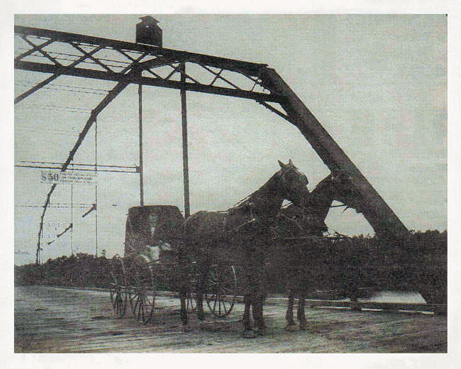 An over-head truss bridge spanned the Black River, on North Grand Avenue, in the early 1900s. George Sontag, a pharmacist who worked at the C. C. Sniteman Drug Store during that time, is shown with his team of horses and buggy as they were traveling over the bridge. (Photo courtesy of the Sontag family collection)