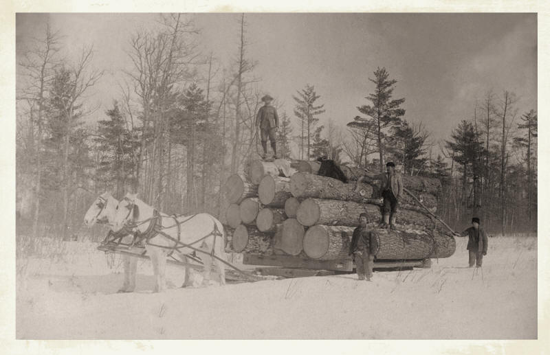 O. E. Counsell has in his possession, a much prized photograph of a logging camp crew taken in Robert Garvins camp, which was located ½ mile west and 1/2 miles south of the present Star Corner cheese factory, 51 years ago. Only two of the 21 members of the crew are still living in Clark County; Mr. Counsell of this city, then 17 years of age, and Charlie Wagner of Globe. Most of the men, including Frank Marg who passed away two weeks ago in Pine Valley, are deceased. One of the four yoke of oxen, used in the camp, and a number of horses were also included in the picture.