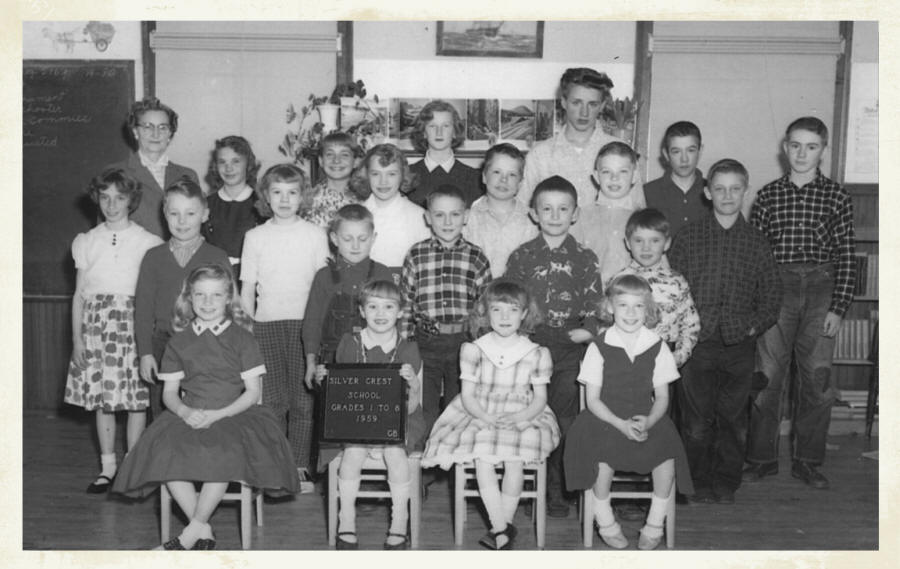 Students of the Silver Crest School – 1959, left to right, 1st row: Donna Zank, Veronica Reams, Janice King and LuAnn Zank; 2nd row: Carl Nemitz, Fred Mohr, James Mohr, Allen Mohr and David Mohr; 3rd row: Diane Reams, Jeanette King, Carol King, Jerry (Joe) King, Ronald Zank and Marvin Mohr; 4th row: Mrs. Ivy (teacher), Edna Mohr, Donna Mohr, Sharon Hawklin, Francis Reams, Donald (Duke) King and Gordon Smith. (Photo courtesy of Carl Nemitz)