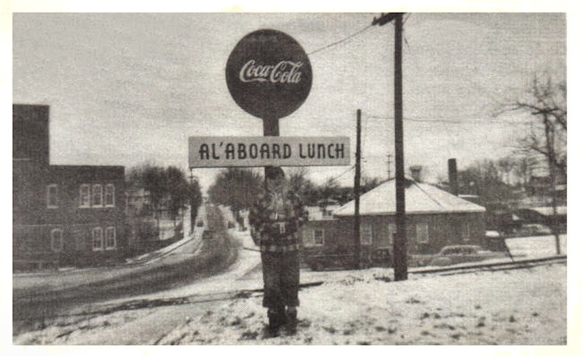 A unique diner was located along Hewett Street and near the railroad tracks, called the Al’Aboard, deservingly so as it was an abandoned railroad car converted into a diner. The above sign, taken in the late 1940s, was located near the sidewalk, in front of the building. Visible in the background are the railroad tracks, as well as the Condensery at the left, Hewett Street Bridge in center and the old American Legion Hall at the right. (Photo courtesy of Gordon Thoma’s family collection)