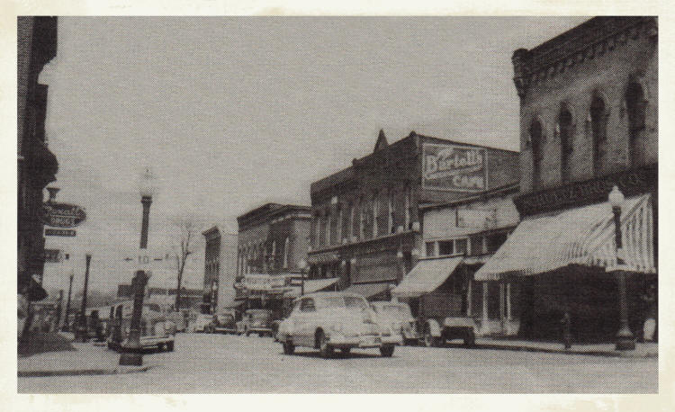 A circa 1940 scene of Hewett Street in the 500 block, on the east side: The Schultz Brothers store is on the far right, in the old building, which was razed and replaced with a one-story structure. The wooden building, next door, accommodated two shops, Maytag Appliances and Neverman’s Variety.