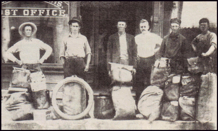 The Neillsville Post Office was located in the middle of the east side of the 500 block of Hewett Street, circa 1910. There were five mail carriers, each shown with their daily delivery items in front of them, one having a new auto tire amongst his items. The fourth man from the left, in the white shirt, was the postmaster. (Photo courtesy of the Roy Strebing collection)