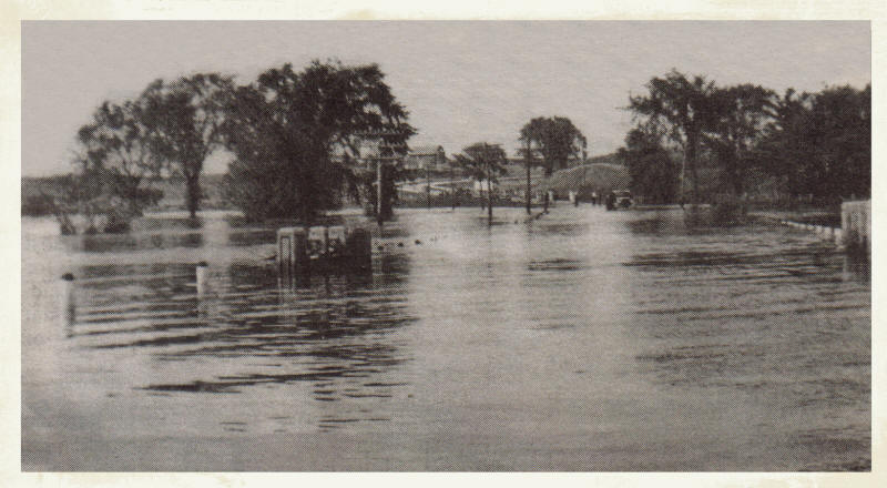 The above photo was taken September 17, 1938 on Highway 73, one mile south of the Division Street intersection, where a normally small creek empties into the Ross Eddy area of Black River. A large amount of rainfall at that time flooded the creek and highway with only the top portion of the guard rails and creek’s concrete bridge railings visible. (Photo courtesy of the Roy Strebing Family)