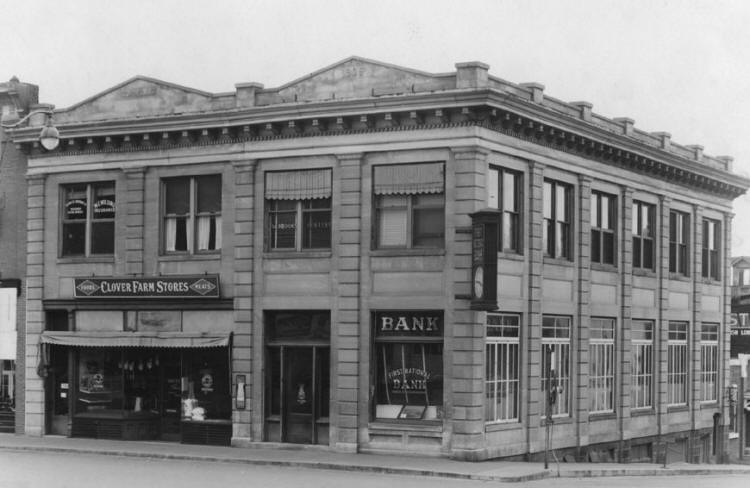 Prochazkas Clover Farm Grocery Store was located in the First National Bank Building, corner of West 5th and Hewett Streets in the 1930s and early 1940s. (Photo courtesy of Bill Roberts collection)
