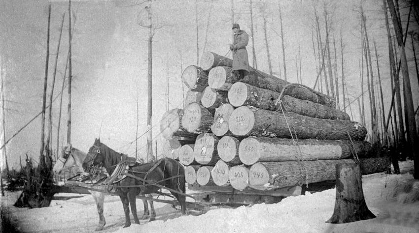 The above circa 1860s sled load of 23 choice white pine logs is an example of the virgin timber that was harvested from Clark County forests in the first cuttings.