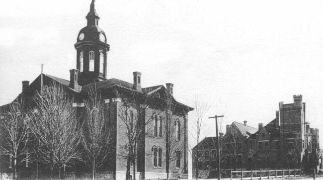 Clark Countys second courthouse, 1879-1965, was built at a cost of $35,000. It replaced a frame courthouse structure built on Court House square in 1954 at a cost of $1,800. The 1897 Clark County Jail building is on the right. (Photo courtesy of Bill Roberts collection)