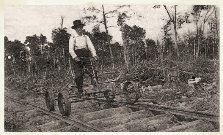 W. F. Tibbett rode his railcar through the timberland between Radisson and Hayward as a supervisor-foreman checking on lumberjack crews of logging operations at the turn of the 20th century. In the 1920s, two of his sons worked at logging in Clark County and they also operated an ice & fuel business for many years. (Photo contributed by Richard Tibbett of Neillsville, grandson of the late W. F. Tibbett)