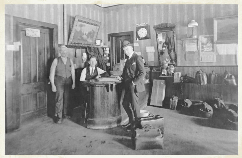 Harry F. Wilsmann owned and operated the Merchant’s Hotel starting circa 1920. He was later assisted in the business by his son, William H. At that time there was a coffee shop-restaurant in the hotel, which was also managed by the Wilsmann family. In the photo, Harry F. is standing on the left, William H. is seated behind the hotel lobby desk and a traveling salesman is standing on the right. (Photo courtesy of Robert Wilsmann, Sr., Grandson of Harry F. Wilsmann)