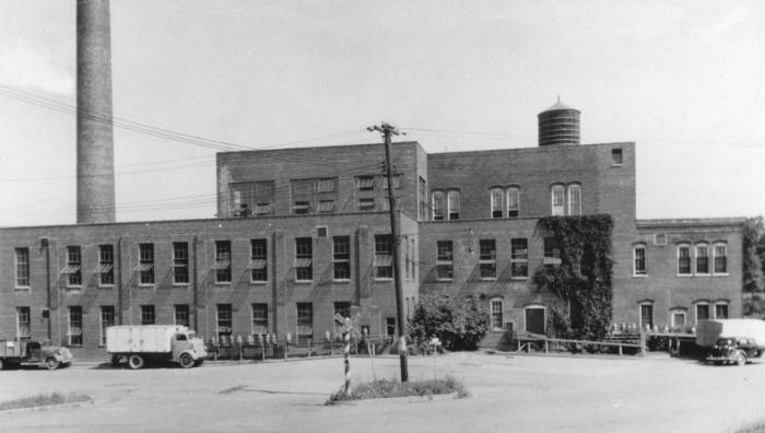 A common sight while driving along Hewett Street in the 1940s, on the west side of the street just before the ONeill Bridge, was that of milk trucks lined up along the south side of the Condensery building with their drivers waiting to unload the filled milk cans onto the intake apron of the milk plant. It was the days of much activity during the Condenserys operation at that site. (Photo courtesy of Bill Roberts)