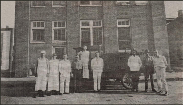 The above early 1900s photo was taken of employees standing by a delivery truck on the brick street in front of the then ice cream factory along the 300 block of West 7th Street. The building was later remodeled for the Neillsville Milk Pool Plant business. The only man identified in the photo is Walter Grottke, standing on the truck running board. |