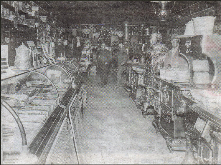 The Radtke Hardware Store was located in the I. O. O. F. building at 140 West 5th Street in the early 1900s. The circa 1910 photo was taken of the interior during a day of business. Those in the photo, left to right, were: Mr. Resong, Herbert Radtke (in knee pants standing on the sales counter), Tom Hommel, and Mr. Radtke. The man at the far right, between stoves, was not identified. |