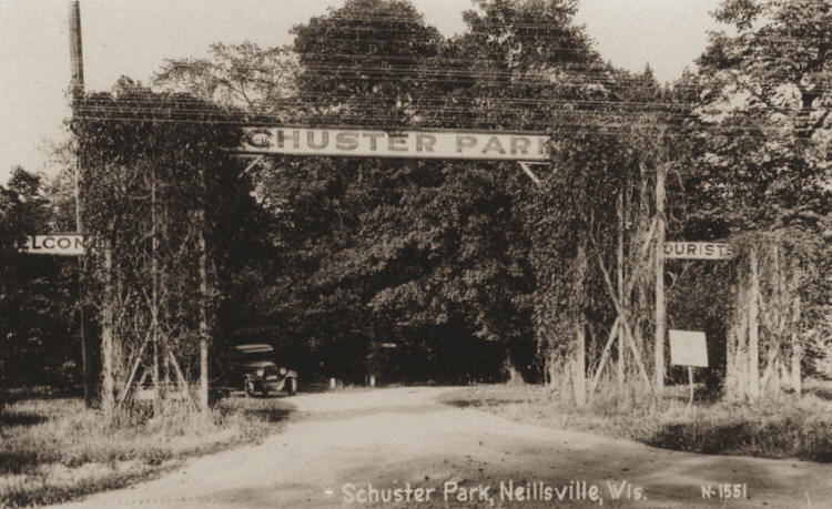 The Schuster Park entrance from Division Street/Highway 10 as it appeared in about 1920. At that time the park bordered a farm field on the eastern side. Every summer the park has been a convenient place with shelters for picnics and family gatherings under the shade of trees surrounded with ample playground equipment to entertain the youngsters. |