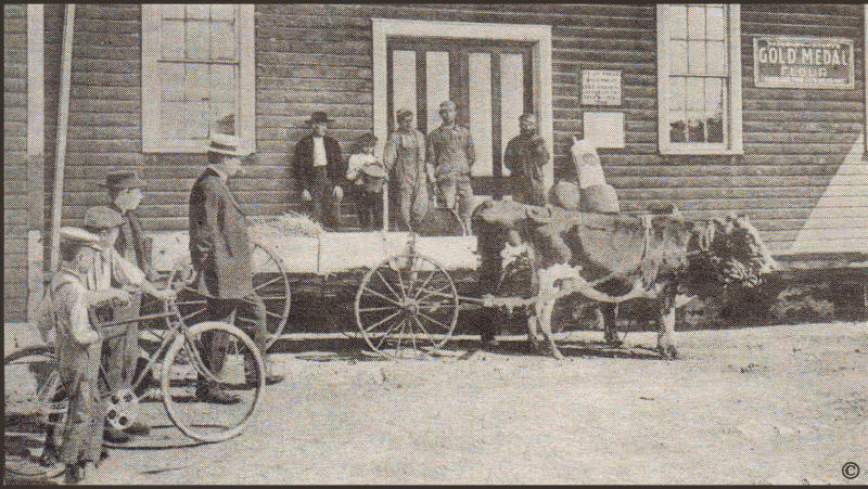 This scene was captured by camera in the late 1800s, taken in front of a Neillsville grist-flour mill. It was the era when oxen, rather than horses, were used to pull the grain-laden wagons over the rough country trails to town. |