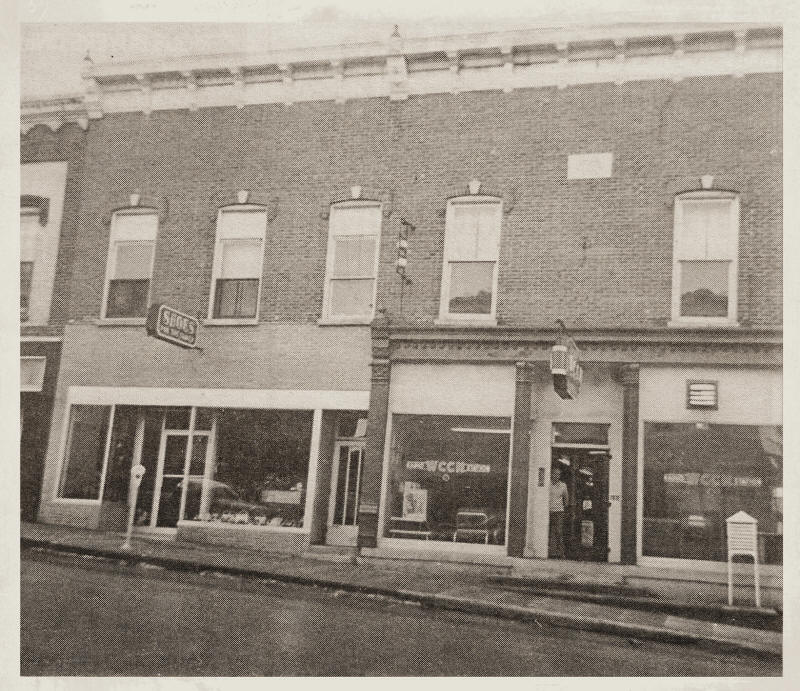 The above photo, taken in 1961, is the IOOF building located along the 100 block of West Fifth Street, south side; at that time, appeared on a sign Shoes for the Family, store operated then by Oscar Dimps Gluck, which occupied the left half of the building while the WCCN radio station, started by Howie Sturtz, was set up in the right half of the structure. |