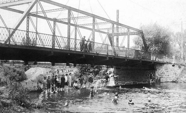 The circa 1930 photo was taken when children within the area enjoyed diving off the Hewett Street O’Neill Creek bridge into the pond below, above the dam on hot summer days. The dangerous diving practice was discouraged by the elders and eventually curtailed. (Photo courtesy of Bill Roberts’ collection) |