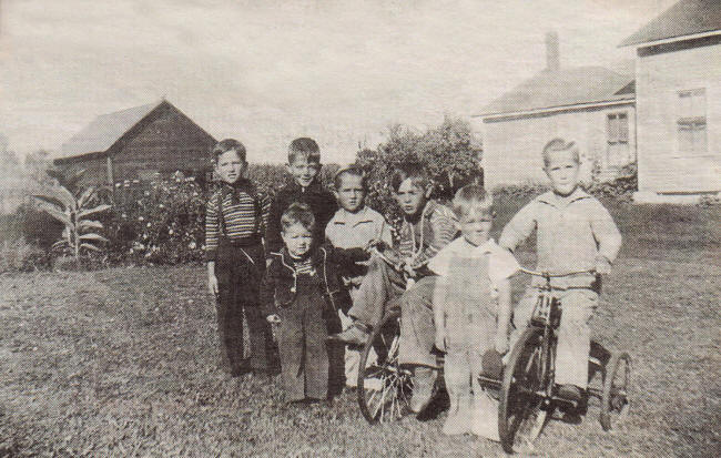 The above photo, taken in late summer of the early 1940s could be fittingly entitled, The Neillsville North Side Buddies, who lived on the east side of Hewett Street, along the 11th through 12th street blocks and eastward to Emery Street. This group of playmates was made up of, left to right: Snick Quicker, Gale Gall, Jerry Quicker, Jack Tibbett, Jim Rahn (first bike), Melvin Gall and Jim Tibbett (second bike). (Photo courtesy of Jerry Quicker)