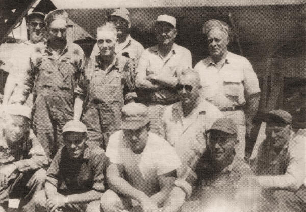 The above photo, taken about 1957, is that of the Southern Clark County Highway Department workers; left to right, front row: Oscar Walk, Bill Kurasz, Art Murphy, Ted Schoenherr and Ray Eggiman; second row: Wilbert Lortz, John Bryan and kneeling, wearing sunglasses, Bob Zschernitz; third row; Arnie Carl, Ted Dux, Alex Gall, and Harvey Krause. (Photo courtesy of Lynn King and Doris Dux) |