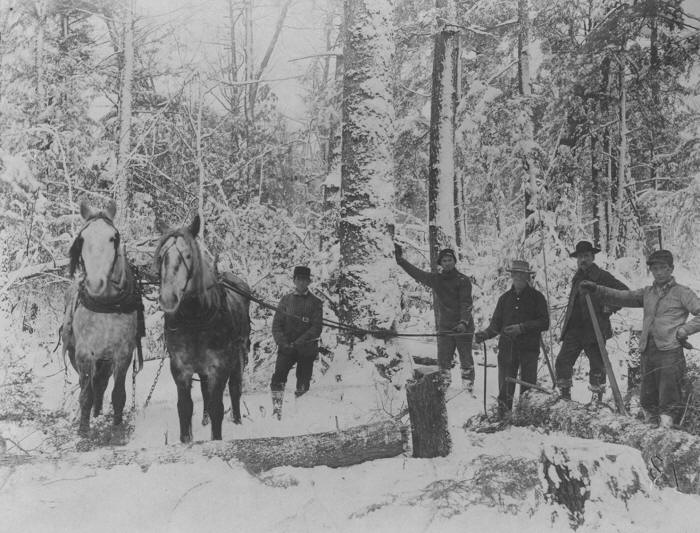 A typical logging scene, loggers using a team of horses, in preparing to snake logs out of the woods to an accessible location along the sled trail.