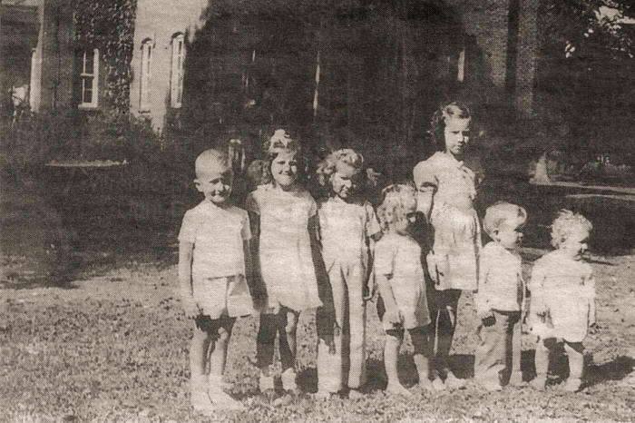 In the late 1940s, a group of neighborhood kids gathered to play around the North Side Grade School, living in that area. Shown left to right: Donnie Campbell, Mary (Aumann) Langreck, Marilyn (Hubing) Gregorich, Sharon Dux, JoAnn (Wasserburger) Bush, Jim Wasserburger and Doris Dux; standing with 12th Street in the background |