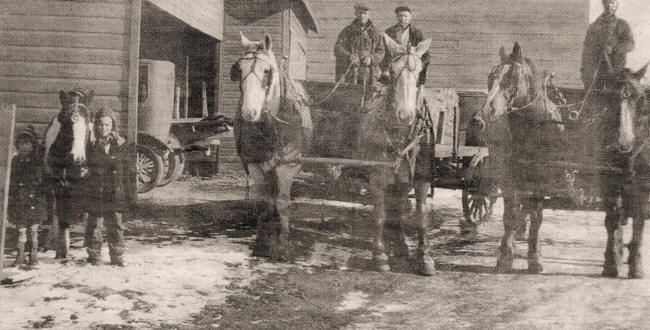 Shown above are two teams of horses with their teamsters by barns on the Hauge property along