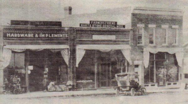 The above photo was taken along Grantons Main Street about 1915. The Hardware Implement store was owned by W. J. Thayer. Adjoining next door was Harts Store General Merchandise Store. The hardware store advertised some items displayed on the front sidewalk. Third building isnt identified. (Photo courtesy of Ron Webster) |