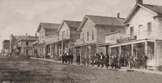 An early 1870s photo was taken on the west side of East Street (now Hewett Street). On the far left is Neillsvilles first brick building built in 1872. The Harness Shop, on the southwest corner of Sixth Street, could be either that of J. P. Dudley or Sol Jaseph. O. P. Wells business building is the fourth building from the right and Fred Klopfs Cheap Cash Store is the first building on the right. |