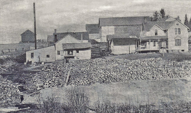This 1880s photo taken of the Lynn Cheese and butter factory behind cords of logs for the nearby heading and shingle mill. At that time Otto W. Becker owned and operated the cheese plant, receiving 8,000 to 10,000 pounds of milk daily from 60 patrons in the area. Most of the butter and cheese was hauled to Marshfield for shipment. The Becker home is shown to the right. |
