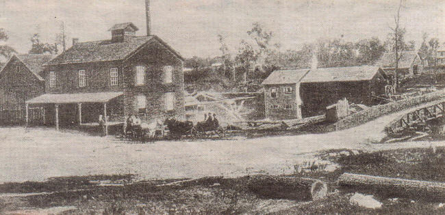 In 1845, James ONeill, a brother Henry, three friends and a few laborers arrived in what is now Neillsville. Upon arrival, they felled some trees and built a cabin along the shore of ONeill Creek. After its completion they built a saw mill nearby, constructed of logs in the bed of the creek, which contained one upright saw. Upstream, white pine trees were cut, trimmed and floated down the creek to the saw mill to be cut into lumber. The photo shows the saw mill on the north side of ONeill Creek, second building to the right. |