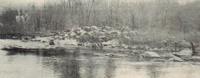 This photo taken in 1953 of the old Hemlock Dam site, about four miles north of Greenwood where most of the large rocks on the far side of the Black River remain from the old dam structure. Along the dam site was one a thriving hamlet, Hemlock, with a boarding house, little store run by Baxter Shaw, two houses and two shanties. Nearby was the Withee farmstead. |