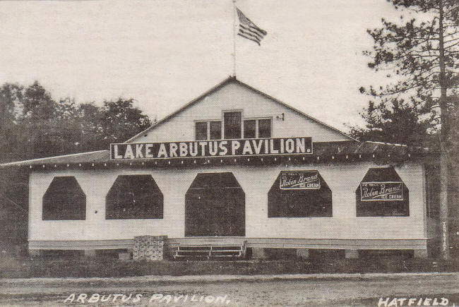 The Lake Arbutus Pavilion dates back to the 1920s. It served as a popular roller skating site through its early years of existence, as well as providing a place for evenings of dancing. Recently remodeled, the building serves the Hatfield community with a food menu and place for family events. It will soon mark a 100-year anniversary. |