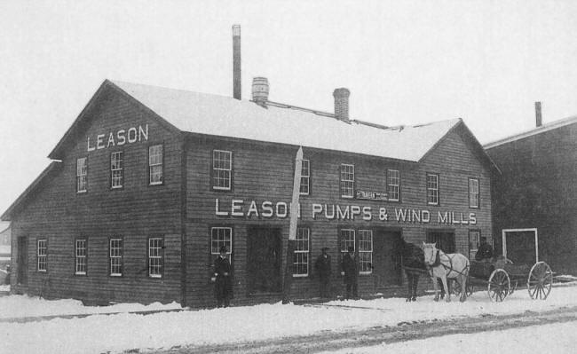 A. S. Leason & Sons windmills and well pumps were manufactured in a building which stood on the east side of North Hewett Street, in the 1200 block, in the late 1800s and early 1900s. Many windmills were sold in the surrounding rural area, with few remaining today. One of those windmills, to be identified by the word Leason on one of its fan blades, still stands on the north side of County Road H in the Town of Fremont. |