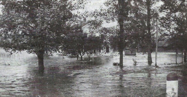 The above photo was taken of the floodwaters on the former Indian School Property, west side of Black River, along the South side of old Highway 10, now CTH B, during the 1943 flood. Mark Vornholt Sr., manager of the Indian Schools farm operation, lived in the farmhouse shown in the background. As shown, the water level is up to within a few inches of the porch floor. Also visible is a rope with one end tied to the third tree from the left and the other end tied to a post on the front porch of the house. A few longtime Neillsville residents remember the ONeill Creeks flooding of the Grand Avenue Bridge area in 1943, when the creeks flood waters of the nearby houses were at the same level as that of this past week, being 73 years ago. |
