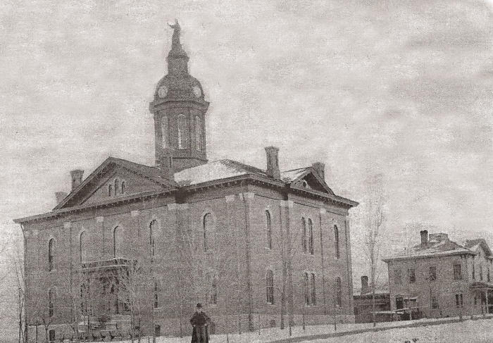 A wintry scene surrounded the Clark County Courthouse building, in the above photo taken shortly after it was built in 1879. This structure served its purpose until 1965, when it was torn down and replaced by the present courthouse building. The first courthouse, frame building was built on Courthouse Square in 1854 at a cost of $1,800. The Clark County Jail building was then located on the southwest corner of the property. |