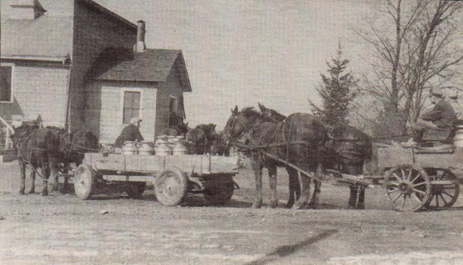 The above photo, taken in 1941, is of a couple of area dairy farmers sitting on their horse-drawn wagons, waiting in line by a cheese factory. Each morning they would haul a 24-hour collection of milk, in 10-gallon cans, to a nearby factory. At that point in time, there were over 60 cheese and butter factories in Clark County, one every few miles, often located on an intersection corner with a schoolhouse on the opposite corner. School-age children would conveniently have a wagon ride to school. |