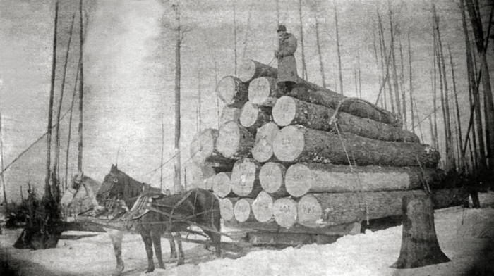 The above photo, taken in the late 1800s, was of a load of 23 virgin pine logs being hauled out of an area woods. The logs were strapped onto the bobsled with heavy log chains to hold the load in place. A team of shod horses pulled the bobsled over iced trails out to a landing. |