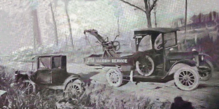 A circa 1920 photo of Seif & Byse Ford Companys wrecker truck on a service call to pull a car out of a ditch along Highway 10, west of Neillsville. |