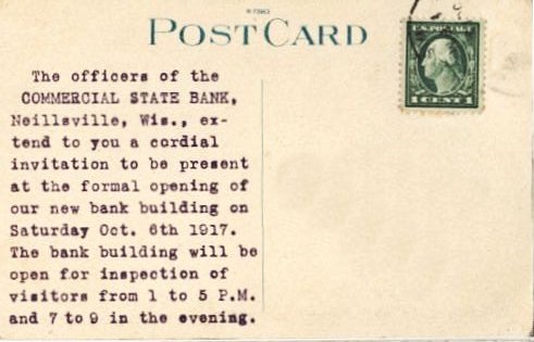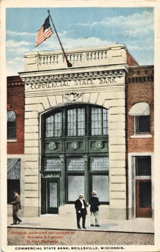 The Commercial State Bank of Neillsville was organized June 30, 1898, opening for business July 1, 1898, in a building on the ONeill block. The business moved to a 500 Gates block building (West Hewett Street) in October 1898, rebuilding that structure in 1917. In 1924, it became the Dairy Exchange Bank, closing in 1929. Eventually, those stocks went to the Neillsville Bank. (Original Photo courtesy of Steve Roberts, but substituted with a postcard from Virginia Elmhorst.) |