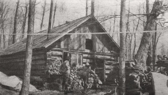 A typical late 1800s, early 1900s maple sap cooking-shack, with living quarters, kept out in the woods. It was conveniently located close to the sap-collecting center with a large pile of split wood nearby that was needed to keep a just-right fire under the sap pan, that cooked the sap down into syrup. |