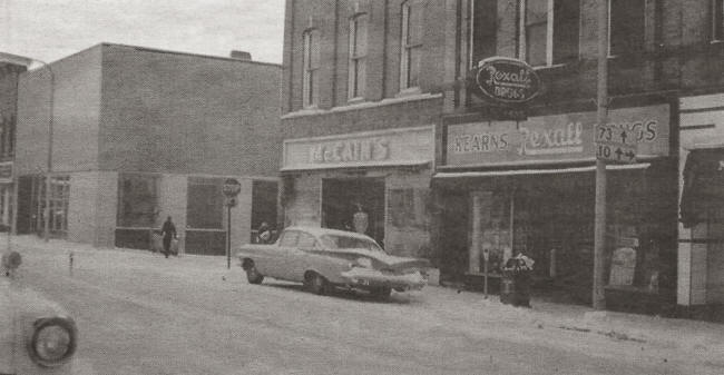Above is an early 1960s view of the West Fifth and Hewett Street intersections north-west corner. Also visible is McCains Department Store (former J. C. Penneys) and Kearns Rexall Drug. (That car a 1959 Chevrolet, could well be the light-colored car we owned back then. DMK) |