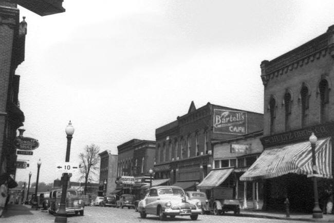 A 1940s view of the East 500 Hewett Street block. Visible is the two-story Schultz Bros. Co. building, on the corner, A & P Foods was at the south-east corner at the end of the block, with five other businesses occupying stores between. See the early-model truck parked along the street, an antique model even then. |