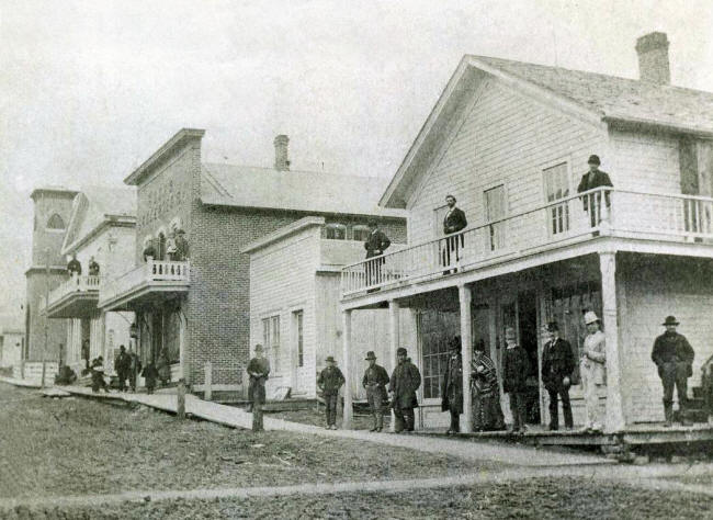 An 1878 view of the southeast Hewett and Fifth Street intersection. The building to the right, on the corner, was then owned by B. F. French. Neillsvilles first courthouse was in the third building to the left. The bell tower of the Presbyterian Church can be seen in the background, the church building was destroyed by fire in the 1930s. |