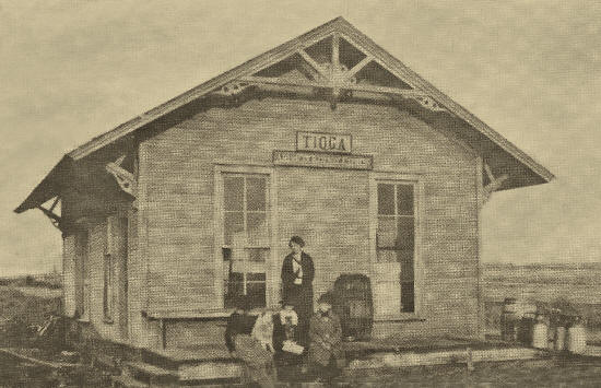 A photo of the Tioga railroad depot taken in the summer of 1917, which was located along County Road I, three and one-half miles west of the junction of County Roads G & I. Next to the people standing on the depot dock are some milk cans, to be put on the train and shipped to a nearby cheese factory by local farmers, prior to having their own factory. There is one vacant building that remains along the former Tioga railroad tract, a remnant of the past. |